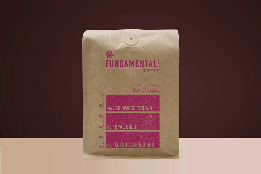 Fundamental Silk Road Blend is anchored by two special coffees from Vietnam and completed with rare Indonesian coffee from Toraja, Sulawesi. Vietnam Opal Bold Reserve is grown near Da Lat in the Lam Dong Province in the Central Highlands. The coffees in the region are grown by small scale farmers at high elevation and using exacting standards. Opal Bold is processed using the wet-hulling method which yields a spicy, herbal and mild aged tobacco note. Lotus Lam Dong is grown in the same region however is a washed process coffee which delivers a more mild, sweet and chocolate flavor. Rounding out the blend is a spicy, triple picked Toraja coffee from the K-shaped Indonesian Island of Sulawesi.